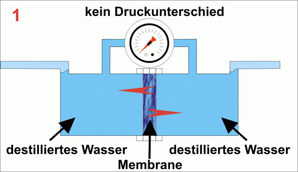 Trennt man zwei gleichartige Flüssigkeiten durch eine halbdurchlässige Membrane, so wandern nach dem Prinzip der Brown`schen Molekularbewegung Wassermoleküle von beiden Seiten im Wechsel durch die Membrane. Der osmotische Druck ist gleich Null.