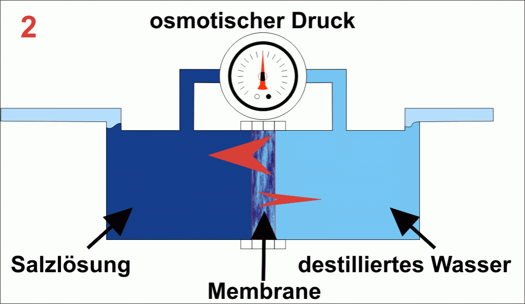 Trennt man zum Beispiel destilliertes Wasser von einer einprozentigen Salzlösung, so wird auf der angereicherte Seite durch die Salzionen die für die Wassermoleküle freie Fläche verkleinert. Dadurch wandern mehr Wassermoleküle zur verunreinigten Seite. Es entsteht ein osmotischer Druck von etwa 6,8 bar. Die Salze diffundieren nur langsam durch die Membrane so dass nach einiger Zeit auf beiden Seiten der Membrane die gleiche Konzentration herscht und der osmotische Druck sich ausgeglichen hat.