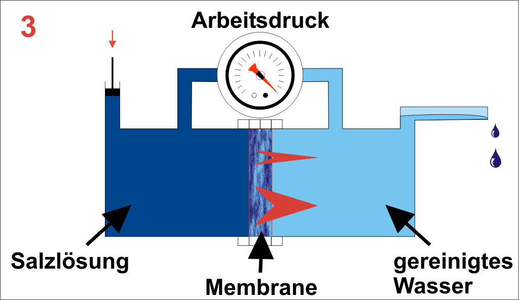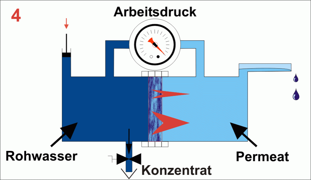 Drückt man nun auf der verunreinigten Seite mit erheblich mehr als dem osmotischen Druck, so wandern hauptsächlich Wassermoleküle durch die Membrane in Richtung der sauberen Seite. Die gelösten Stoffe bleiben vor der Membrane zurück und reichern die Flüssigkeit dort an. Diese Aufkonzentrierung würde den osmotischen Druck erhöhen und das System käme zum Stillstand. Im Grunde handelt es sich aber um eine mechanische Filtration.