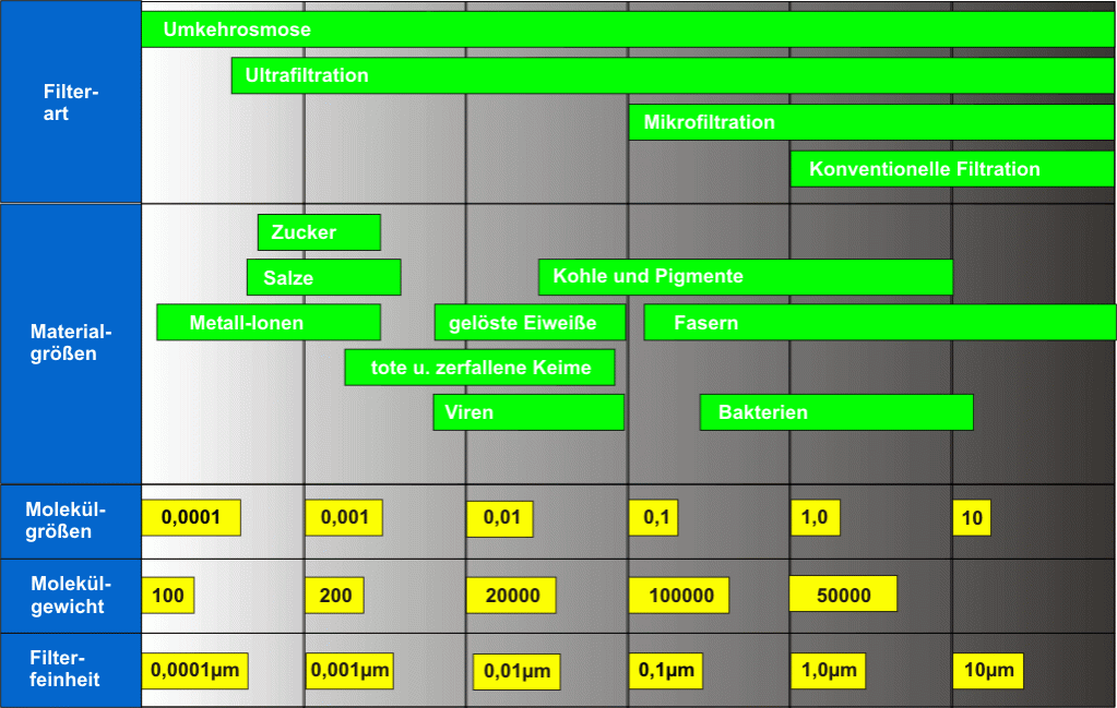 Die Tabelle zeigt verschiedene Stoffe der Größe nach geordnet. Umkehrosmose arbeitet, wie ein sehr feines Sieb. Dieses "Sieb" filtert Ionen im Molekularbereich. Das macht auch die Kontrolle der Wirksamkeit so einfach. Da sogar einzelne Atome wie gelöste Schwermetalle oder kleine Ionen wie Natrium und Nitrat reduziert werden, hat das gute Wasser der pureblue eine geringe Leitfähigkeit. Stoffe mit höherer Molekülgröße sind dann schon längst stark reduziert. Liegt die Leitfähigkeit im guten Bereich unter 80 Mikrosiemens, produziert die pureblue gutes Wasser.